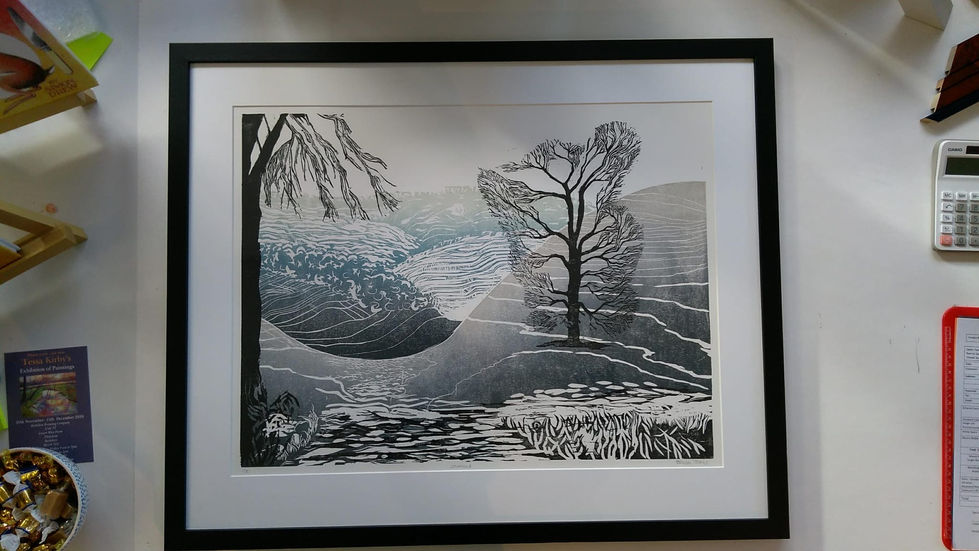 A collection of framed artwork featuring silhouettes of animals, botanical pieces, and landscape paintings with natural themes.